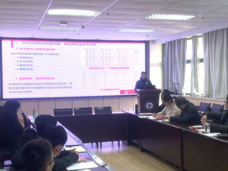本次会议由学生党建工作负责人张钦同志主持,各支部书记通过PPT进行工作汇报,限时5分钟。各党支部书记分别从支部概况、工作开展情况、存在的问题及自查情况、改进措施及下一步工作计划等方面进行总结答辩。储建学院本科生土木17级第一党支部书记董晖就部分党员同志缺乏平台去发挥党员的先锋模范作用问题,支部组织成立“党员先锋岗”,让每一位党员都可以投身到年级的工作当中;储建学院储运17级第二党支部书记王仁杰就支部学习强国积分低的问题,形成“学习强国监督值班制”,让每位党员的每天的学习强国情况受到大家的监督,达到“抢着学、比着学”的效果。最后,储建学院党委书记高平发在工作点评时指出:“现在学院的党员发展比例虽然有所提升,但是一定要追求质量。各位党支书务必严格把握好党员发展流程,抓思想、抓意识、抓入党动机,成熟一个发展一个。并且各支部书记要做到党建工作的规范化,以便更好的推动学院党务工作的进行。”